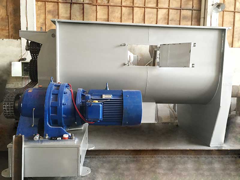 混合機根據物料性質、啟動方式、以及攪拌方式配置不同能力、不同功率、不同輸出轉速的驅動裝置。雙軸式無重力混合機由于內部槳葉成嚙合關系,配置的雙軸驅動動力需具備同步能力,推出四種驅動組合可用于不同的能力需求:雙齒輪箱同步組合式、單齒輪箱雙出式、雙行星齒輪同步式、過橋鏈輪鏈條式。